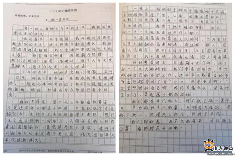 2月1日下午,山东大学齐鲁医院内科主管护师于书卷接到援鄂通知回到家里,贴心的女儿不仅支持她,临行前还帮妈妈购买所需物品、收拾行李。女儿说妈妈去了抗疫第一线,她在家写作文就有了新素材。妈妈抵达武汉的次日早晨,女儿就把医生妈妈出征的事写进了作文:“有这样一群人,逆着人流前行,他们不辞辛劳,从全国各地奔往武汉,抗击疫情。”“妈妈整装待发,拎着箱子出门时,给了我一个大大的拥抱,我们要各自努力,尽力做好自己的本职工作。”“我们期盼着,在不久的将来,可以摘下口罩,看那樱花开放。”女儿用细腻质朴的文笔,勾画出妈妈临行前的一幅立体画面。于书卷相信,有家人的鼓励和同事们的关心,以及自己的“软实力”,这场战“疫”一定能打赢。