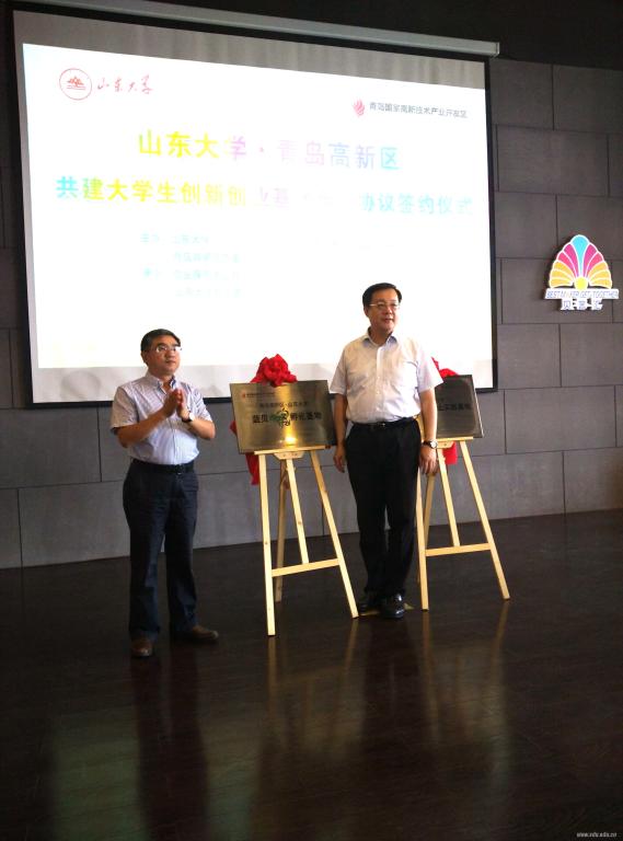 [本站讯]9月24日,“山东大学-青岛高新区共建大学生创新创业基地合作协议”签约仪式暨山东大学项目路演活动在青岛高新区盘谷创客空间举行。签约现场还举行了“青岛高新区-山东大学蓝贝青苹果孵化基地”和“山东大学-青岛高新区大学生创新创业实践基地”揭牌仪式。山东大学副校长胡金焱出席活动并致辞。