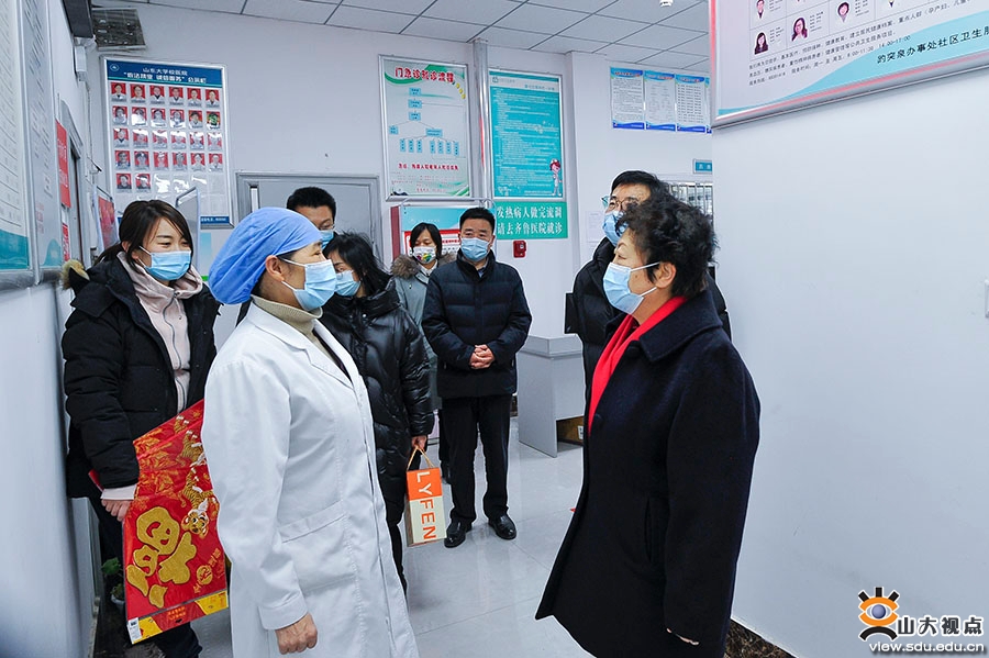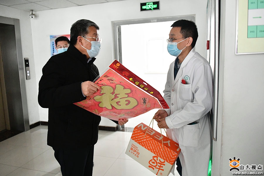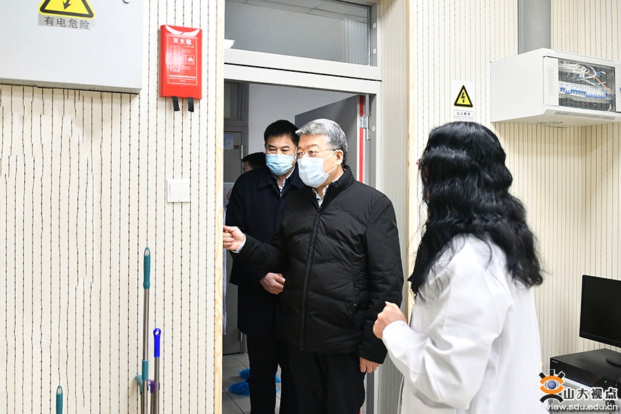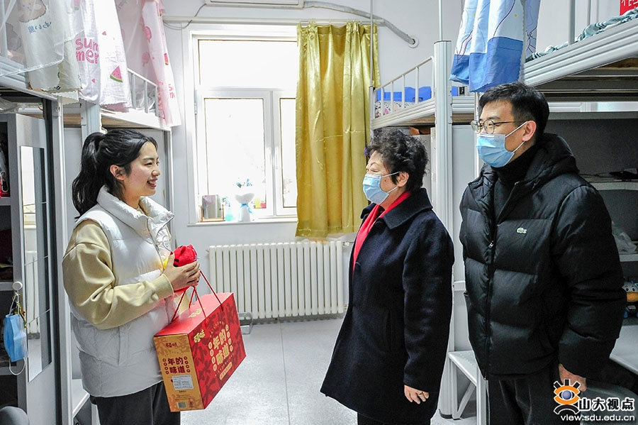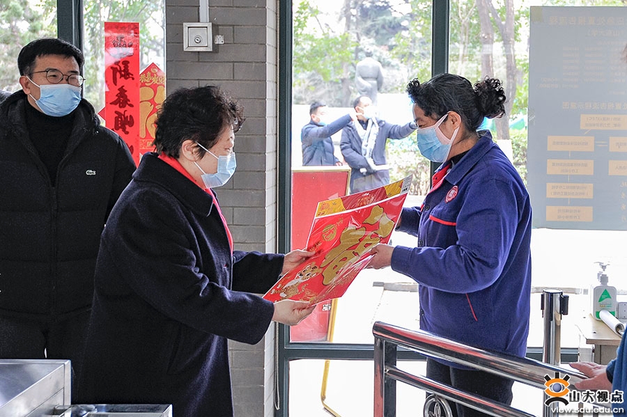 在趵突泉校区,樊丽明先后到校园门岗、学生公寓、图书馆、食堂、教学六楼、景蓝斋、校医院等地,看望慰问了坚守一线工作的教职医务员工和留校过年的学生,感谢他们的辛勤努力,并送去新春的祝福。樊丽明叮嘱服务保障部门要严格按照疫情防控要求,守好校园的安全防线,重点抓好实验室安全、食品安全、消防安全等环节,为留校师生提供安全舒心的保障服务,确保师生医务员工度过一个欢乐祥和的春节。在学生公寓和实验室,樊丽明详细询问了留校学生的生活、学习状况,希望同学们在努力学习的同时,科学合理安排生活,加强体育锻炼,做好个人防护,度过一个健康、快乐、充实的假期,同时她也祝愿同学们在新的一年学业有成、幸福安康。副校长易凡一同走访、检查。