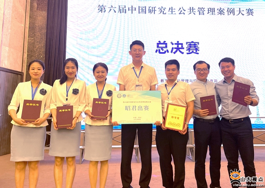 [本站讯]8月14日,第六届中国研究生公共管理案例大赛总决赛在河南郑州举行。山东大学政治学与公共管理学院孙宗锋教授、杨志助理研究员共同指导的“昭君出赛”队(队员:研究生高昭君、苗英荟、刘晨曦、刘铭钧、刘诗琦、张璇),在总决赛中荣获大赛最高荣誉特等奖。山东大学获得优秀组织奖,指导教师孙宗锋、杨志荣获“最佳指导教师”称号,高昭君同学荣获“最有价值队员奖”。