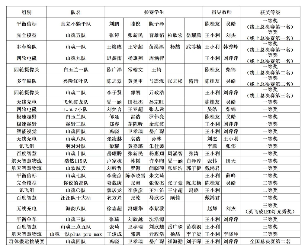 本届全国大学生智能汽车竞赛分为学校选拔赛、分赛区选拔赛和全国总决赛三个阶段。学校选拔赛确定参加分赛区比赛的队伍名单,分赛区选拔赛中成绩突出的队伍获得参加总决赛资格。本届大赛,共设有四轮电磁、四轮摄像头、平衡信标、智能视觉、平衡单车、多车编队、完全模型、极速越野、无线充电等9个竞速组别和航天智慧物流、百度智慧交通、迅飞家庭服务机器人等3个创意组别,来自全国433所高校的2771支队伍参赛。最终有695支队伍进入全国总决赛,最终产生一等奖275项、二等奖323项、三等奖97项。决赛期间,山东大学各组参赛队员分工协作、有条不紊,沉着应对、稳定发挥,最终都赛出了最佳成绩。