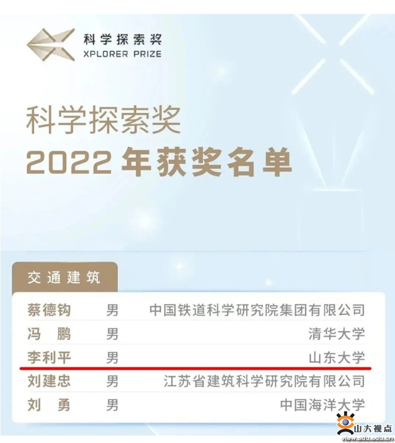 [本站讯]9月15日,2022年“科学探索奖”获奖名单揭晓,山东大学齐鲁交通学院常务副院长李利平教授榜上有名,成为山东大学首位获此奖项的青年科学家。