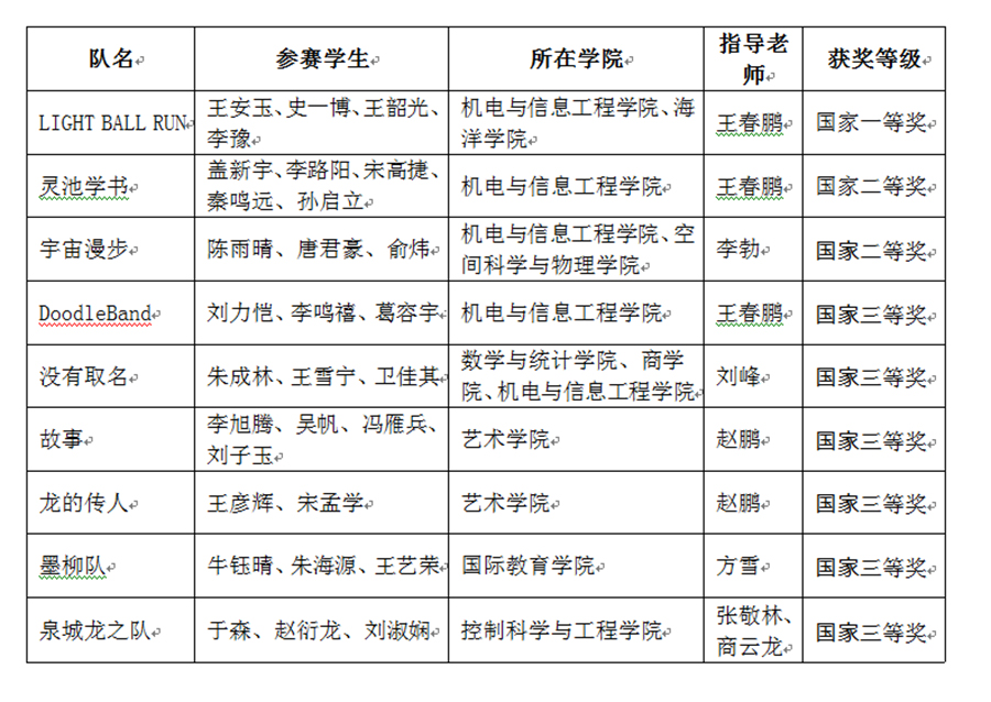 本次比赛的主要获奖团队分别来自机电与信息工程学院大学生创新创业基地、艺术学院、国际教育学院和控制科学与工程学院。