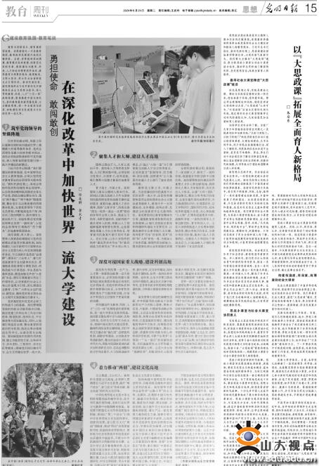 高校要聚力原创性颠覆性创新,牢牢把握科技创新这个发展新质生产力的核心要素,聚焦大信息、大能源、大健康等战略必争领域,主动适应国家科技体制机制改革,统筹自由探索和有组织科研,打造基础研究特区,建设高能级科研平台体系,统筹推动校地企创新资源深度融合,健全以创新、质量和实际贡献为核心的科技评价机制,不断产出更多“从零到一”“从一到百”的突破性成果,当好基础研究主力军和重大科技突破生力军。山东大学主动“揭榜挂帅”,积极承担亿元级国家重大科技任务,攻克碳化硅晶体生长、隧道突水突泥灾害防控等多项关键领域“卡脖子”难题。