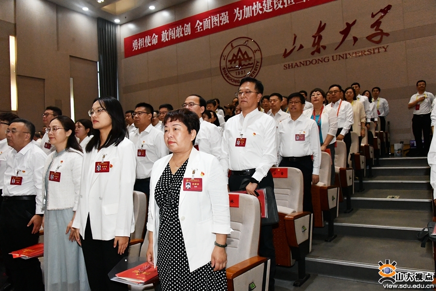 山东大学校园生机勃勃,知新楼A座三层报告厅气氛热烈。主席台上方悬挂着“中国共产党山东大学第十五次党员代表大会”的会标,十面鲜艳的红旗分列主席台两侧,正中簇拥着的党徽熠熠生辉。会场后方,山东大学校名、校徽与“勇担使命 敢闯敢创 全面图强 为加快建设担当民族复兴大任的世界一流大学而团结奋斗”的横幅相映生辉。