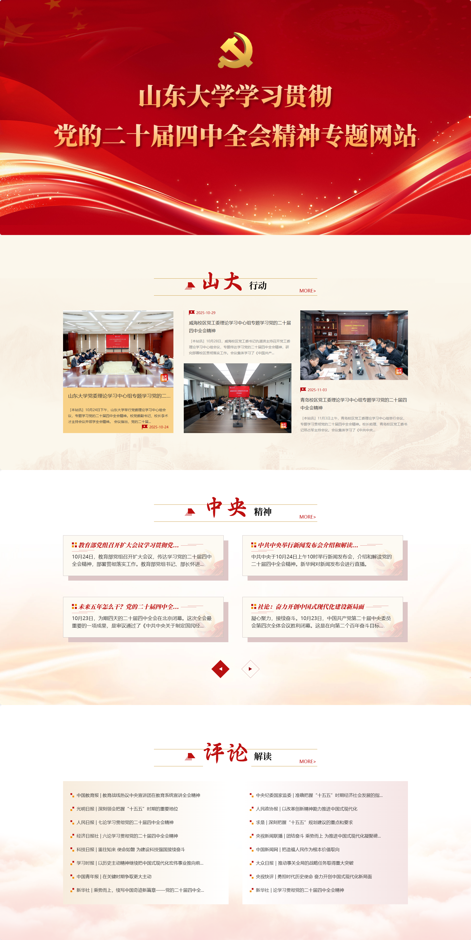 专题网站共设置“中央精神”“山大行动”“评论解读”三大版块。“中央精神”及时传达习近平总书记在党的二十届四中全会上的重要讲话和全会精神,发布党中央和上级部门重要工作部署。“山大行动”集中展示学校贯彻落实党的二十届四中全会精神的实际举措、典型经验和重要成效。“评论解读”精选编汇中央和省级重点媒体对党的二十届四中全会精神的深度解读、评论文章等,助力师生凝聚思想共识、聚力推动谋划,切实将战略部署转化为建设教育强国、支撑引领中国式现代化的具体行动与扎实成果。