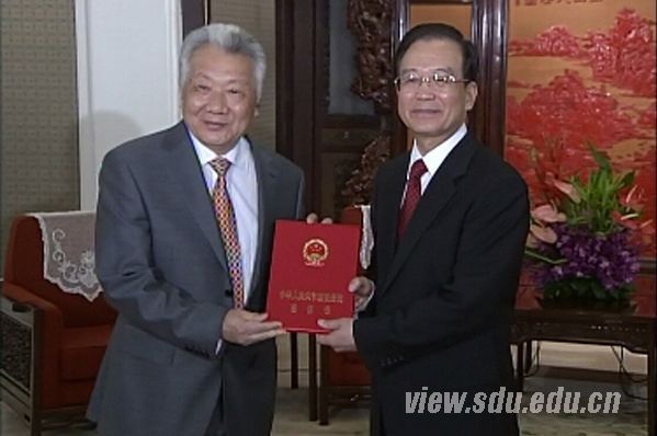 6月15日,中共中央政治局常委、国务院总理温家宝(右)向新聘任的中央文史研究馆馆员、山东大学终身教授刘大钧(左)颁发聘书