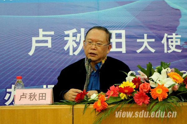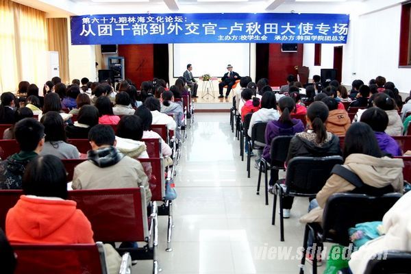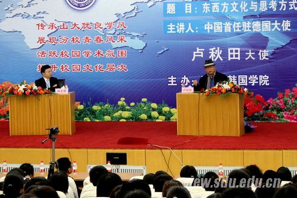 [本站讯]10月25日,中国首任驻德国大使卢秋田应邀做客山东大学威海分校第20期“大使讲坛”,为分校500余名师生作了题为“东西方文化与思考方式的差异”的主题报告。