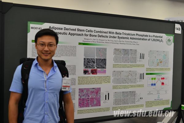 [本站讯]近日,口腔医学院博士研究生吕晟宇代表骨代谢研究室应邀参加了2014年美国骨矿盐研究学会(ASBMR)年会,并以“Adipose Derived Stem Cells Combined With Beta-Tricalcium Phosphate Is a Potential Therapeutic Approach for Bone Defects Under Systemic Administration of 1,25(OH)2D3”为题同参会各国科研工作者进行了深入讨论和交流,该科研成果被录入ASBMR 2014年会会刊。会议期间,吕晟宇还积极宣传和介绍了学院的科研、医疗和教学等情况。