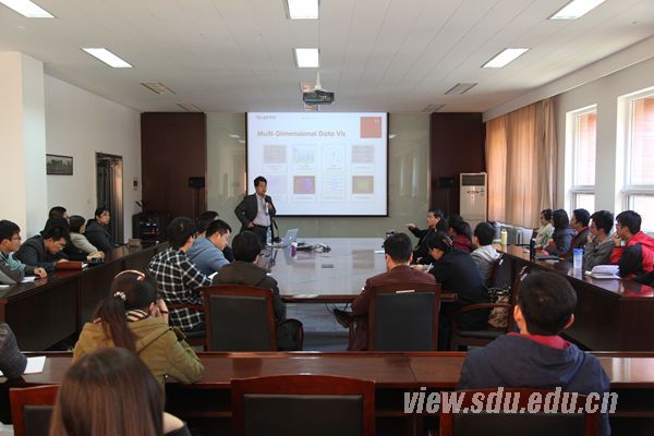 袁晓如研究员在报告中介绍,科学计算手段的进步、超级计算中心的发展,大科学装置等产生巨大的数据,人类生活和网络活动产出了前所未有的信息,但拥有大量的数据并不等于获得相应数据的价值,复杂数据对发展相应的分析工具提出了新的挑战和要求。随后,他介绍了高维数据可视分析、时空轨迹分析、网络数据分析等可视化研究中的重要课题。座谈中,袁晓如研究员与在场师生从数据规模,数据复杂性、可扩展性等多个方面讨论了在大数据时代可视化与可视分析面临的挑战和机遇。