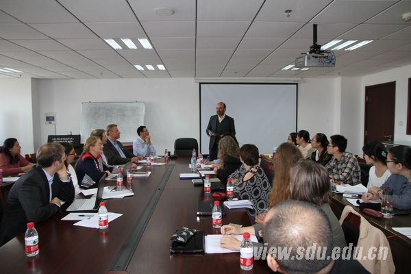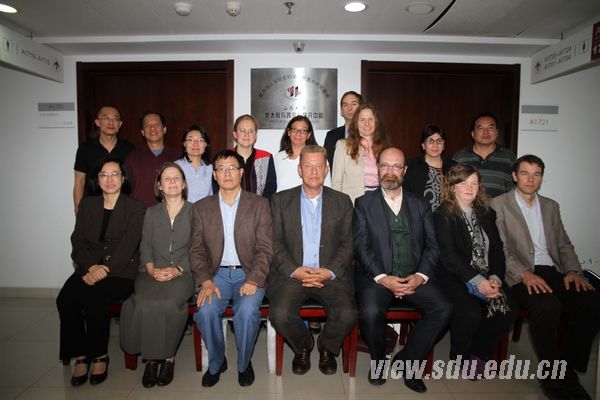 山东大学犹太教与跨宗教研究中心主任傅有德教授向代表团介绍了中心的发展历程、研究领域、学科特色、研究成果,以及学术团队成员的基本情况。著名汉学家、德国爱尔兰根大学生命预测研究中心主任朗宓榭教授(Prof. Michael Lackner)和波鸿鲁尔大学凯特汉堡学院主任Volkhard Krech教授分别介绍了代表团中来自各自机构的成员。Volkhard Krech教授还详细地介绍了他所领导的宗教研究中心跨学科研究的宗旨、机构的基本架构、研究领域和研究生项目等情况,表达了真诚的合作意向。