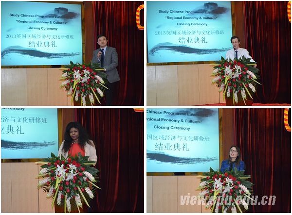 邹难在致辞中对来自英国的学生和领队老师为这个项目顺利进行付出的努力表示感谢,并肯定了他们在山东大学的学习成果。他还对参与组织此项目的国际事务部工作人员、授课的老师和教授以及为此项目付出了大量时间精力的志愿者们表示了赞赏。Heselwood先生对山东大学此次活动的组织工作表示肯定,希望英国学生可以通过这个项目了解中国,为自己未来的学习和工作提供参考。典礼上,英国大学生Diarra Brown、志愿者代表李上上和国际教育学院教师代表张杏春分别发言,国际教育学院的3名汉语教师为各自班级的共48名英国学生颁发了结业证书。