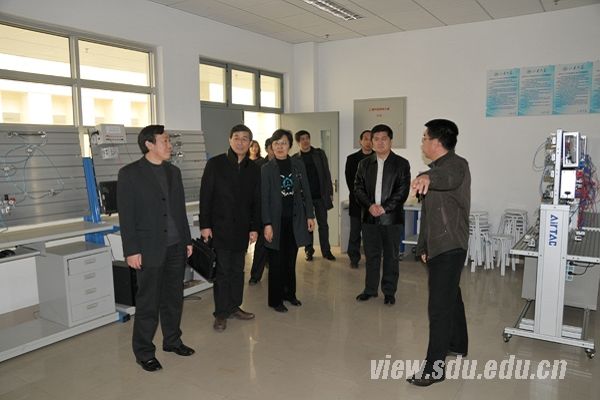 禚淑萍一行的主要目的是考察实验教学示范中心规划建设,国家级实验教学示范中心的申报建设程序。马传峰从学校层面介绍了山东大学对于国家级教学示范中心建设的政策支持,在教学实验室和科研实验室资源共享方面,要促进优质资源深度融合和充分共享,通过实验室建设,推进实验教学改革与创新的一些新举措,强调了实验教学中心不仅要“建”,更要突出“用”的重要性。朱瑞富向客人详细介绍了山大工程训练中心发展建设情况,就工程训练中心大楼建设规模、功能定位、训练项目等建设问题作了详细的介绍,重点介绍了国家级实验教学示范中心的申报历程和经验。随后,禚淑萍一行参观了工程训练中心创新、先进技术制造、特种加工、水处理等训练区。