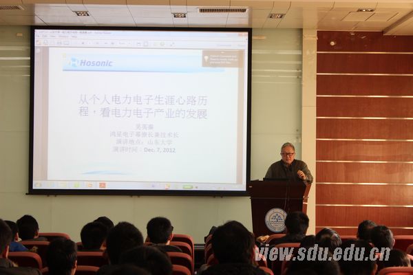 在济期间,吴英秦教授先后和相关领域的专家学者以及学生进行了交流。12月7日上午,吴英秦教授在千佛山校区作了题为“从个人电力电子生涯心路历程,看电力电子产业的发展”的学术报告。报告中,吴英秦教授首先介绍了自己一生的科研及从业经历,由浅入深地介绍了电力电子产业的发展及目前所遇到的难题。吴英秦教授还重点阐述了电力电子产业发展的特点,并针对未来电力电子发展的新亮点与新方向做了前沿性的分析与展望。最后,吴英秦教授还讲述了企业经营诊断、改善与创新等方面的内容,并与大家分享了自己留学及从业过程中的一些宝贵经验。报告精彩纷呈,吴英秦教授严谨而又不失幽默的演讲激发了广大师生对未来电力电子产业发展的浓厚兴趣。报告会由控制学院副院长陈阿莲主持、电子电力研究所所长张庆范教授及控制学院和电气学院百余名师生听取了报告。