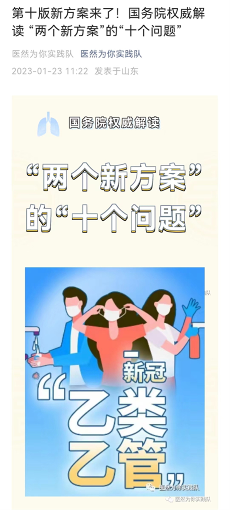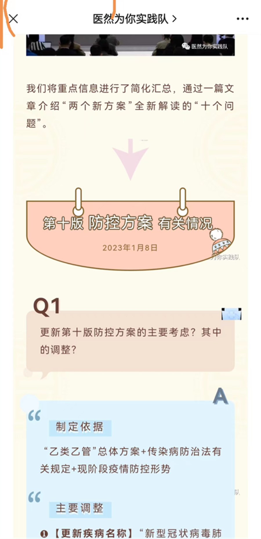 我在中国政府网找到了1月8日和9日两天发布会的文字实录,仔细研读后,我从发布会答记者问中挑选了十个问题进行内容整合:解读了新版防控方案、诊疗方案的主要调整;解释了毒株变异的新情况以及应对;解答了康复抗体、二次传染、疫苗接种、中医治疗、小分子抗病毒药物使用等方面的问题。正值春节之际,我们还总结了春运出行需注意的事项以及健康过年的小“贴士”。经过与队内成员讨论与校对,确定内容后由队员杨可意制作推文,今天在“医然为你实践队”公众号顺利发布。推文简洁清晰地解答了读者们关于新冠病毒的困惑,避免人们走入认知误区:实施“乙类乙管”并不是放开不管,而是强调更加科学、精准、高效做好疫情防控,更好统筹疫情防控与经济社会发展。