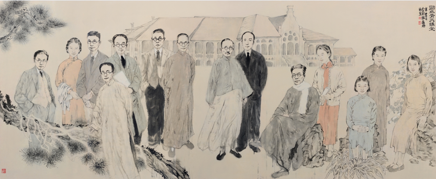 近日,“弦歌不辍赓续华章——山东大学重大主题美术大展”在山东大学中心校区的明德楼和知新楼主厅展出,我与韩廉腾合作的中国画《国立青大讲堂》是参展作品之一,这幅创作主要表现的是20世纪30年代山东大学在青岛办学期间广揽英才,知名专家学者来校任教、讲学交流的盛景。