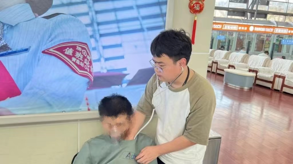 我到现场后发现患者靠在桌旁,脸色苍白,捂胸呈胸闷状,呼吸急促并伴深大呼吸,双手不停抖动,伴有意识模糊。我抚着患者的背部告知患者:“兄弟,不要担心,放松调整呼吸。我是山东大学齐鲁医院的大夫,我在这儿不要担心。”和车站工作人员一起搀扶患者坐到舒适的靠椅后,我为患者做了健康检查。