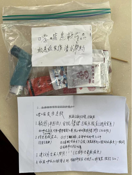 本着授人以渔的原则,在导师司海朋教授的远程指导下,我为患者进行健康急救宣教,明确了现有药品分类和标签,并写明急救方案,制作简易急救包。制作急救包的目的是考虑到后续如果突发不适时,避免非专业人士面对这么多混乱的药品会手足无措。患者生命体征平稳后,给患者留下联系方式后,我放心地离开了现场。