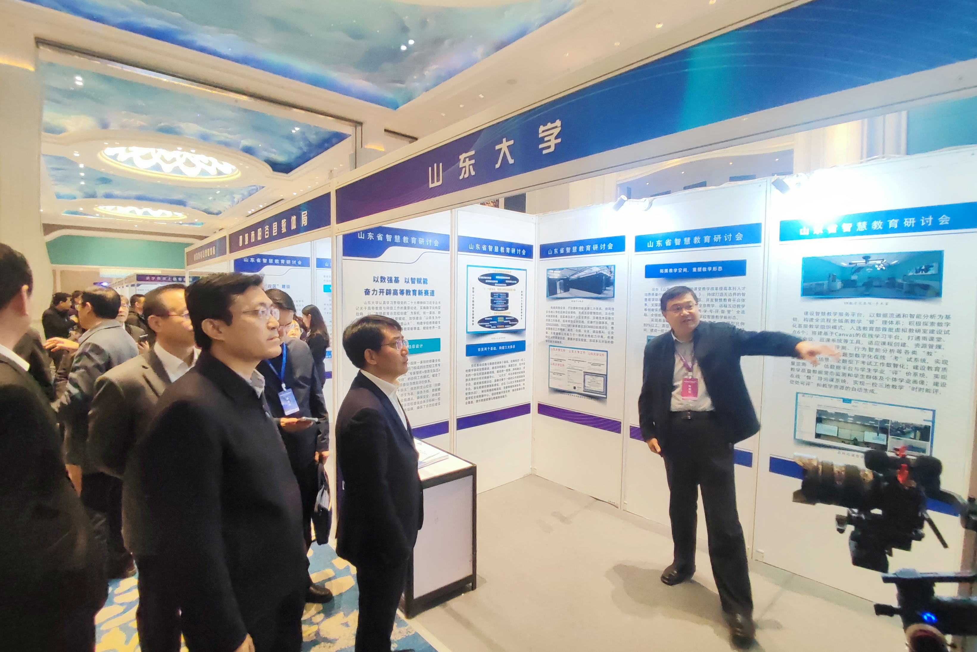 研讨会上,山东大学展示了在智慧教育建设方面的成功案例。副省长邓云锋驻足山大展区,听取了山大智慧校园建设发展情况,对山大数字化转型的做法和成效给予了充分肯定。
