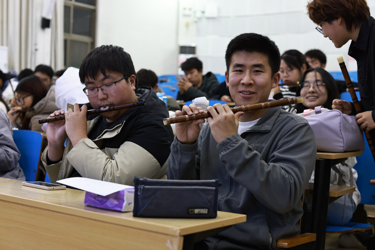 与此同时,二胡工作坊的同学们从一开始自嘲是“锯木头”,到经过练习取得了初步成效,已经能够拉奏出不同的音符;学习陶笛的同学们也已然能合奏一曲《小星星》!这次亲身实践极大地激发了同学们对民乐学习的兴趣。学习自己喜欢的乐器本身就是一种享受,每个人都在探索一个全新的领域,尝试跨过民乐大门的门槛,进入更加高深的民乐殿堂,切身体会“和合之美”带给人们的无穷乐趣。