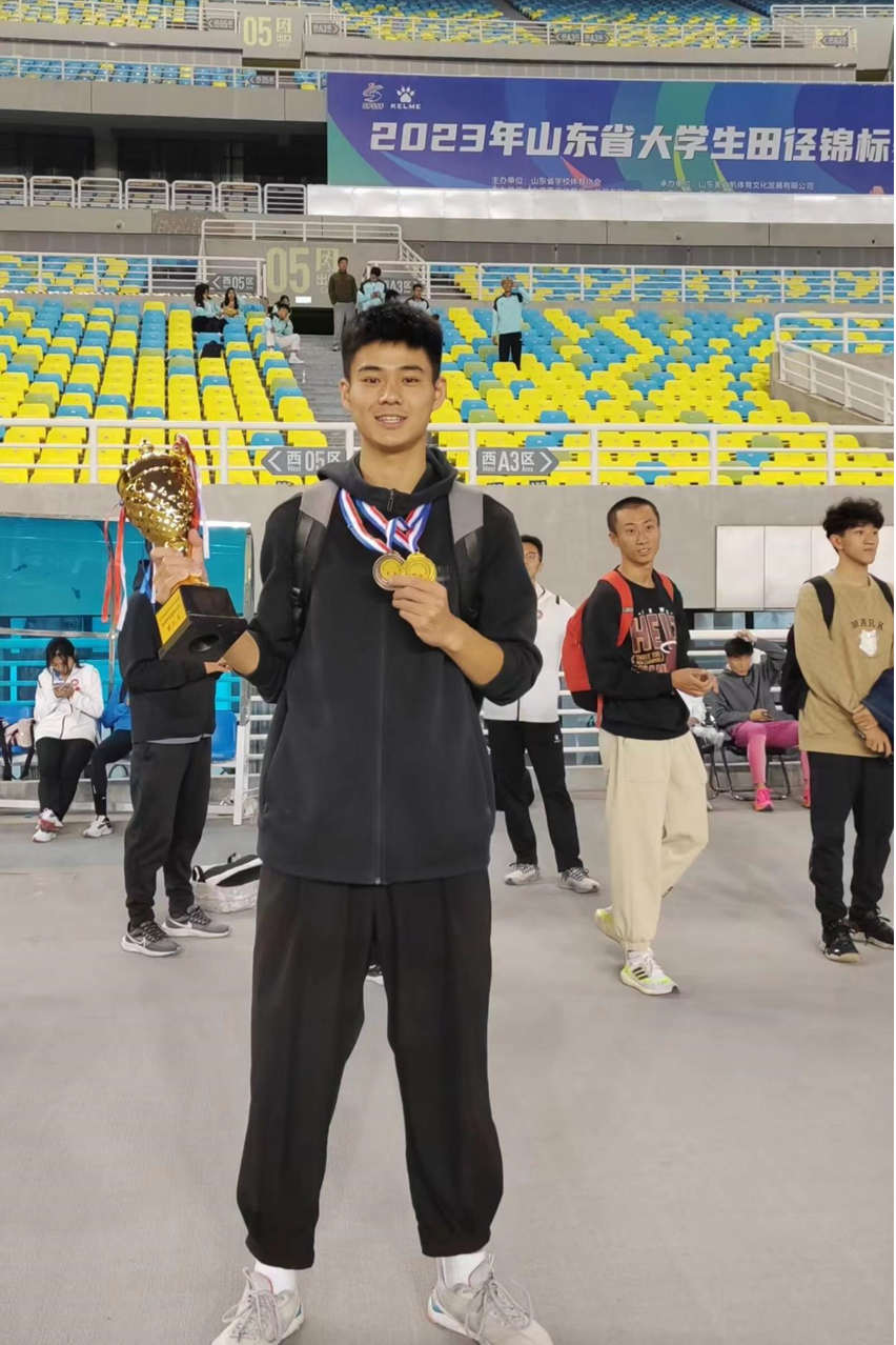 而我也经过两年的沉淀,弥补了2021年省赛无奖的遗憾,先后获得山东省大学生田径赛甲组三级跳远冠军与跳高季军;在青岛市比赛中以跳高1.88m(超国家二级运动员标准、超青岛市高水平组成绩)、三级跳远13.3m的优异成绩斩获我校唯二的两项冠军,为自己大学的田径历程画上了圆满的句号。