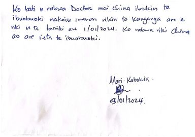 为进一步了解Mari的恢复情况,昨天上午,我们又来到她的家中为她进行查体,并赠送了所需药物。Mari见到我们十分激动,与我们拥抱并手写了感谢信。Mari在信中动情地写道:我想对中国医疗队抢救我的生命表示衷心的感谢,在我心脏停止跳动的2024年1月1日晚上,他们救了我的命,再次感谢中国医疗队。