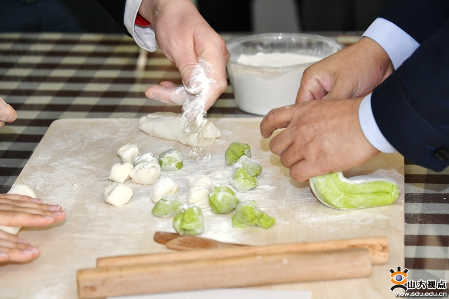 “清水飘芙蓉,元宝落玉盘。”活动伊始,我有幸同校党委副书记陈宏伟、校团委书记马毓轩、马克思主义学院党委副书记王海宁以及4位来自电气工程学院、考古学院和儒学高等研究院的师兄师姐一同包饺子。大家分工合作,一片片蕴意着“紫气东来”和“黄金万两”的饺子皮迅速成型,包裹着寓意吉祥的羊肉馅,寄托着大家对新年的美好愿望。