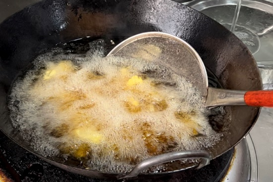 起锅烧油,炸制菜品