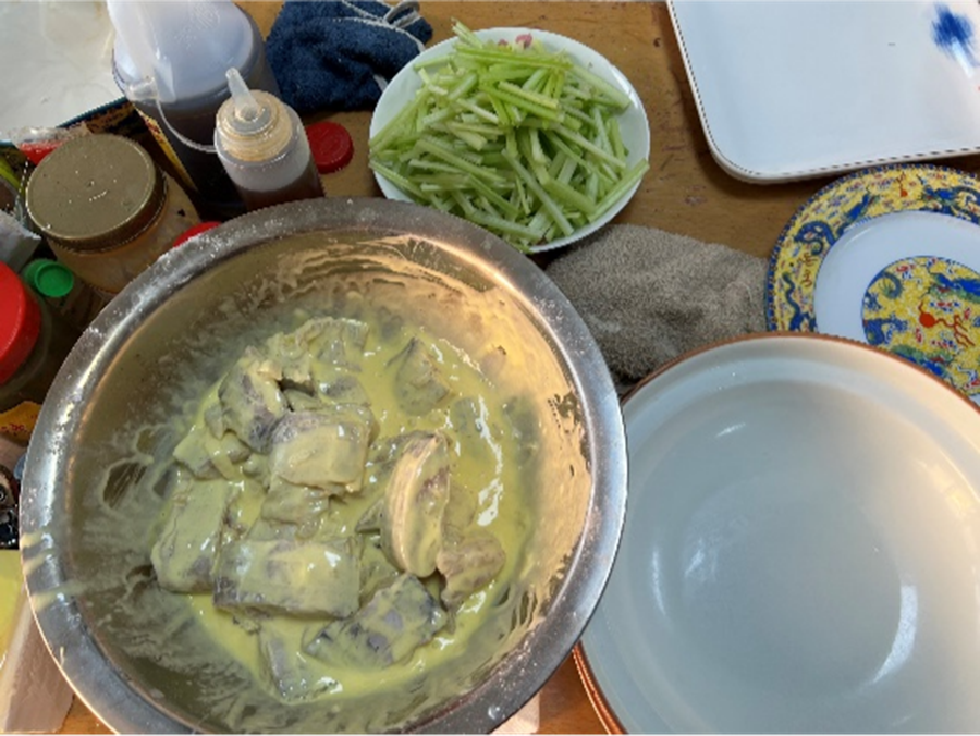 首先要先准备好带鱼,将它的内脏处理干净之后,切成大小约五厘米的段;接下来用盐,大葱,姜等腌制一下;再加入鸡蛋面粉和水制作表面的面糊。作为一个参加过工程训练,焊过单片机板子的工科生,我自认为动手能力比较强,但处理带鱼段还有一些困难,面糊调试了好几次才到合适的浓度来均匀挂上,看来想要做好一道菜并不是一件轻松的事情。