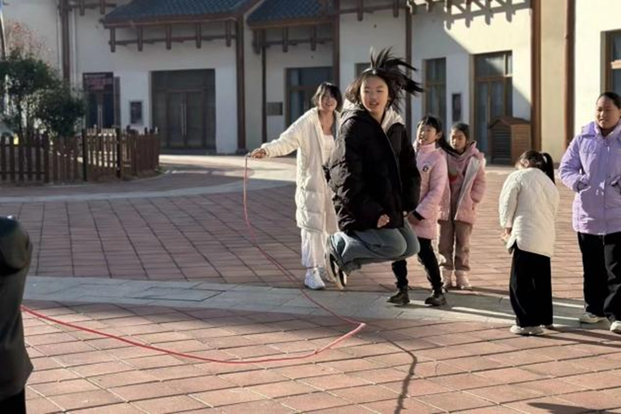 坳不过孩子们的撒娇和笑脸,我和几位队员先带着他们一起在活动中心外的空地上玩玩游戏。冬日虽有太阳,但云贵高原仍有冷风吹过。冷风却吹不走孩子们的热情。在多数孩子的提议下,我和亦曈同学组织孩子们一起跳大绳;深受女同学喜爱的“曼妮老师”,则被拉去一起跳皮筋。听着孩子们的欢声笑语,让我们觉得这样的春节更有特别的价值。