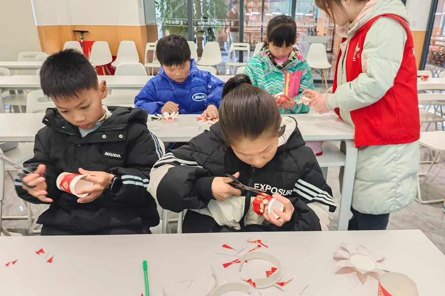 临近十一点,负责采购的同学们终于回来了。他们带回的红色纸杯、彩绳和彩纸,今天便会在孩子们的手中变成一个个花灯,用来装点自己心中最美好的节日。手工是我的主场。我教孩子们如何先将一个杯子的杯壁剪开八份后再沿杯沿卷起来。另一个杯子同样被剪开后杯壁沿相反方向卷,粘合后再进行装点就成了小花灯的样式了。我本来担心这对一些小学低年级的孩子们有些难度,但看着孩子们互相帮助,相互分享自己的成果,我觉得这就已经是春节最好的礼物。之后,我还教孩子们做手工花,一起将教室装点成最美的样子。