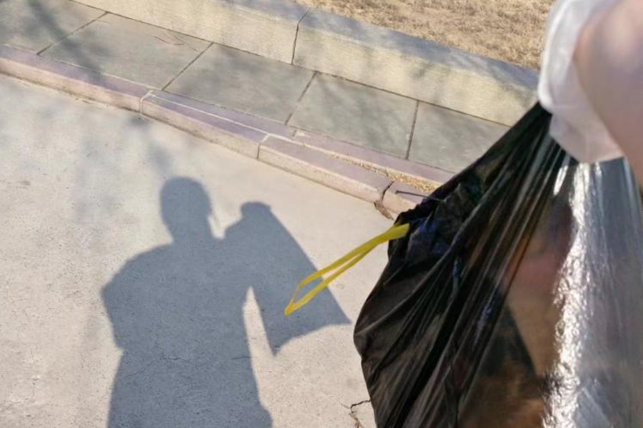 初春的风依旧冷冽,我们不断弯腰、捡拾、将垃圾扔入袋中,所过之处,洁净赏目。半小时过去,我看着手中半满的垃圾袋,心中异常欢喜,干劲满满。一小时过去,疲惫感渐渐席卷全身,我打趣说半天步数要赶上假期好几天的步数了。但当听到路过的人询问我们是哪所大学的,夸赞我们的行为,我不禁十分自豪,继而继续工作!最终,我带着满满一袋“战利品”结束了这次旅程。