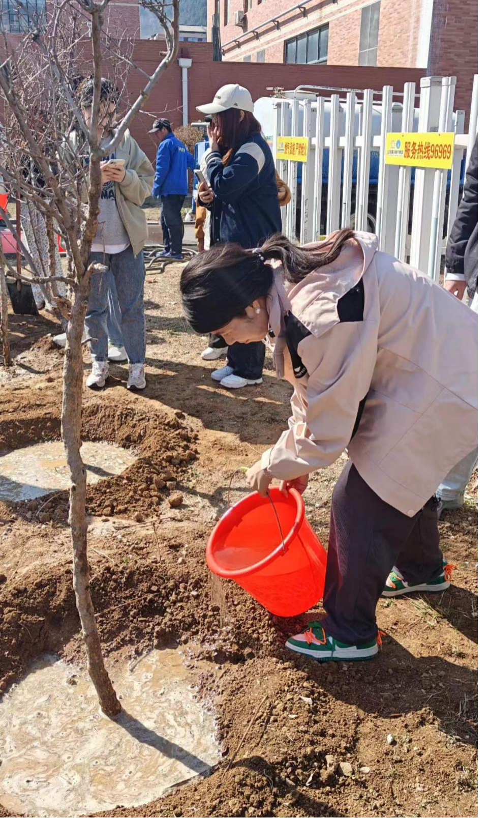 早上,所有参与者在欣园餐厅后集合。活动开始前,兴隆山校区和软件园校区管理办公室赵龙主任向师生说明了“植树节”的重要意义,号召师生用实际行动参与共建绿色校园。他说,开展此次植树活动,既是落实山东大学省级绿色学校创建工作的要求,也是号召各民族要像石榴籽那样紧紧抱在一起,更是学习贯彻习近平生态文明思想的体现。之后,园艺老师向我们介绍了栽树主要流程及注意事项。大家挽起衣袖,拿起铁锹,有序组队,分工协作,共同挖坑、扶苗、培土、浇水……合力栽下了10棵石榴树苗,志愿者们还为植树区栽立了“石榴园”铭牌。党委学生工作部、兴隆山校区和软件园校区管理办公室、能动学院的领导老师还有学院辅导员,山东大学民族预科班,石榴籽社团一起为新种植的树木培土、浇水。老师们的关心和亲身参与,让我们倍感鼓舞。