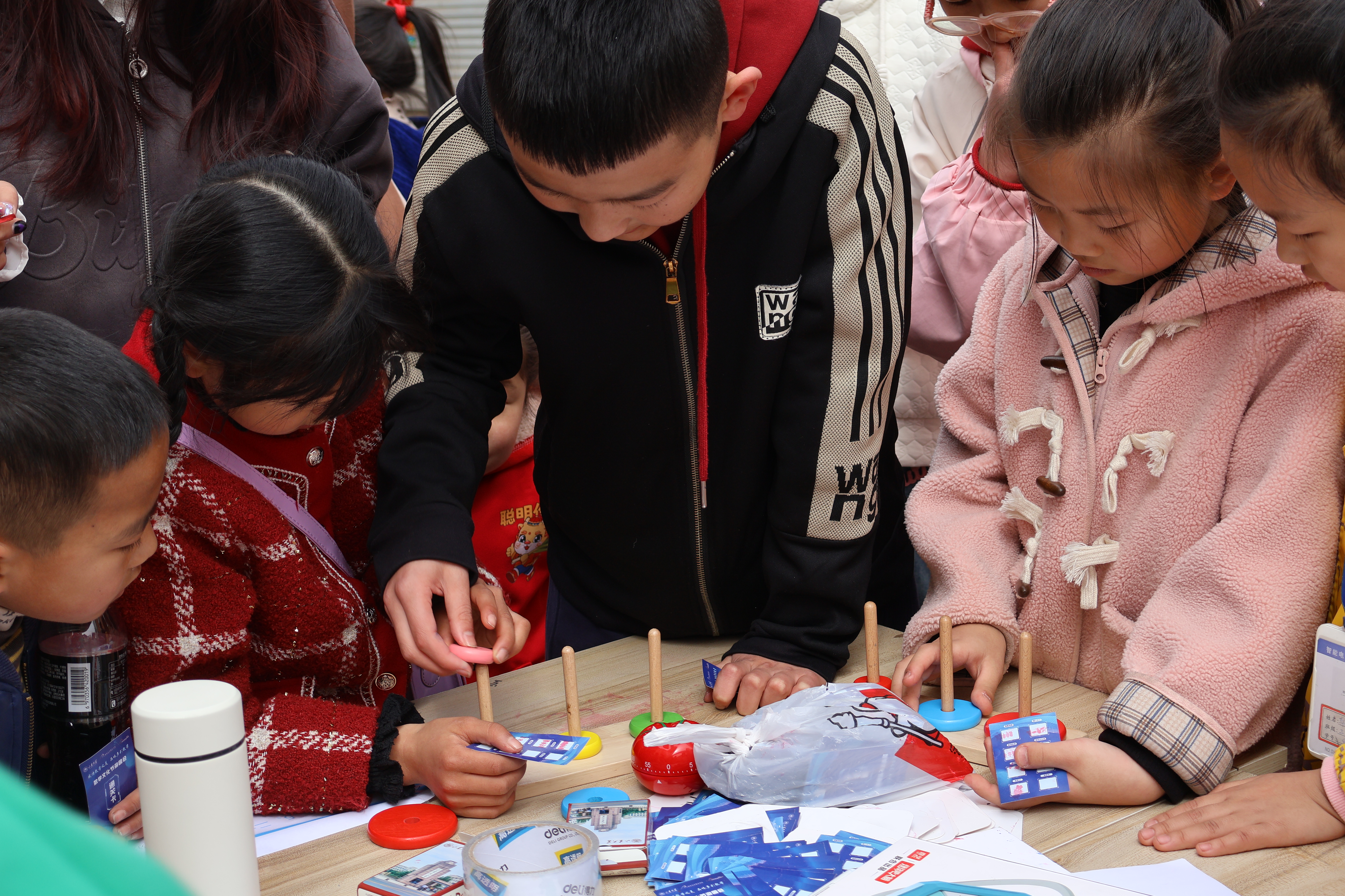 活动临近结束,孩子们一手拿着通关卡兴奋地去兑换学习文具,另一只手中还拿着苦思冥想不得解的题目,玩着浸染着古人榫卯智慧的鲁班锁,最后依依不舍地向我们道别。