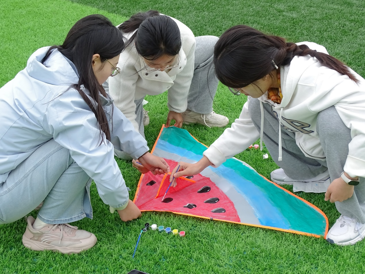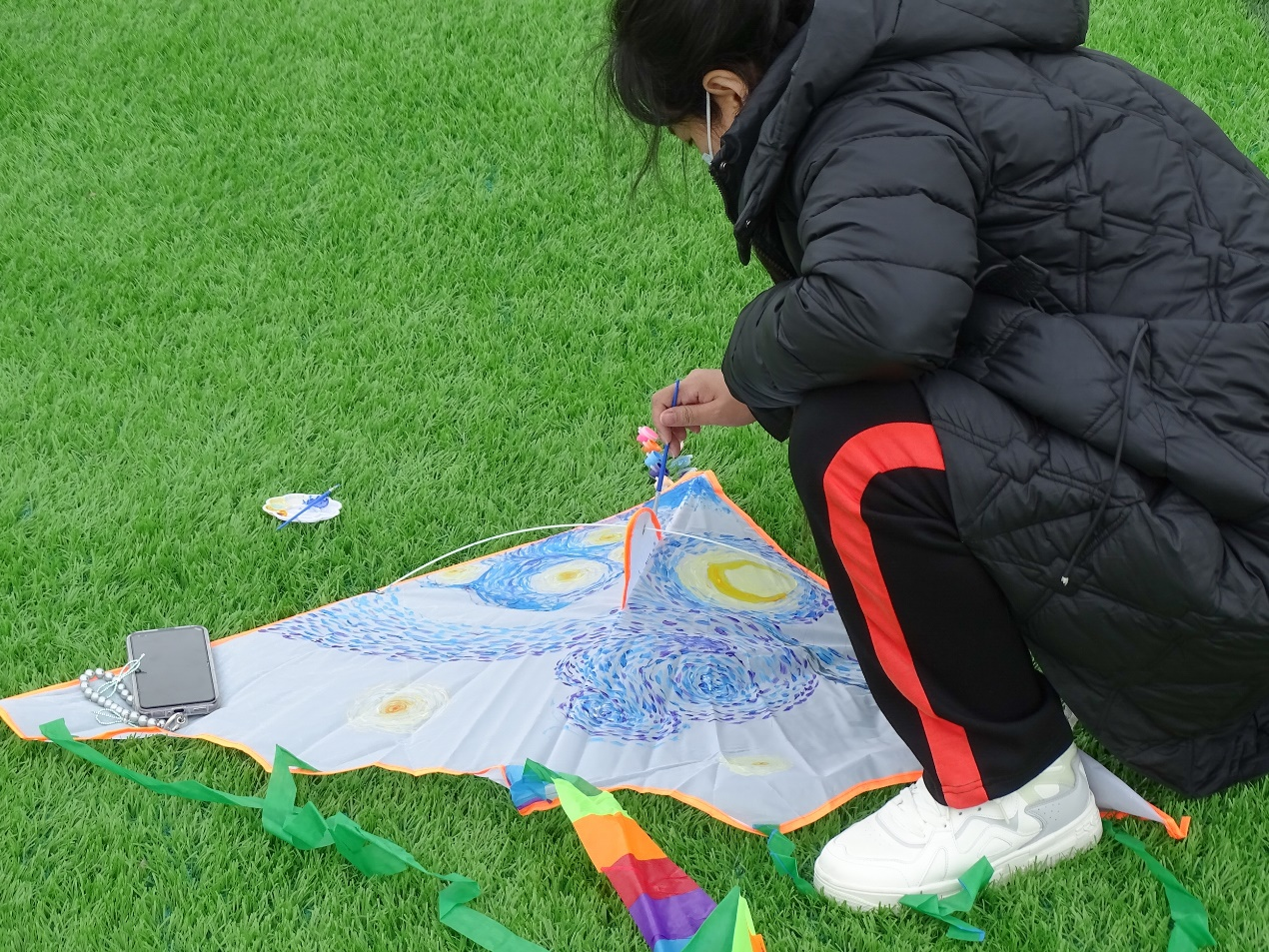 接下来,是风筝面上自由作画的环节。虽然风筝的形状是统一的,但大家在风筝面上的创作却五花八门,各具特色。他们或低头沉思,或挥毫泼墨,或细细描绘;有的人则已经迫不及待地拿起了风筝,准备在操场上放飞。我穿梭在人群中,用镜头记录下了这些富有个性和创意的风筝作品。画有梵高《星空》风筝更是让我眼前一亮,我迫不及待地记录了这个独特的艺术创作,虽然没有看到这个风筝放飞,但是我已经想象到它放飞时的中西艺术结合之美。