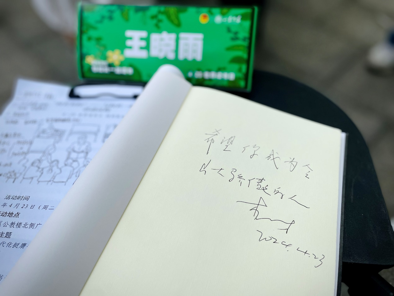 有幸在活动结束后与李校长交流读书感悟,校长亲切地在我分享的书籍上留下赠言,“希望你成为令山大骄傲的人”。这是一句沉甸甸的祝愿、也是一句有力的鞭策。为了实现这个目标,我需要走的路还有很长。我将把校长的这句赠言化作我人生道路上的指明灯,照亮筑梦前行的方向。