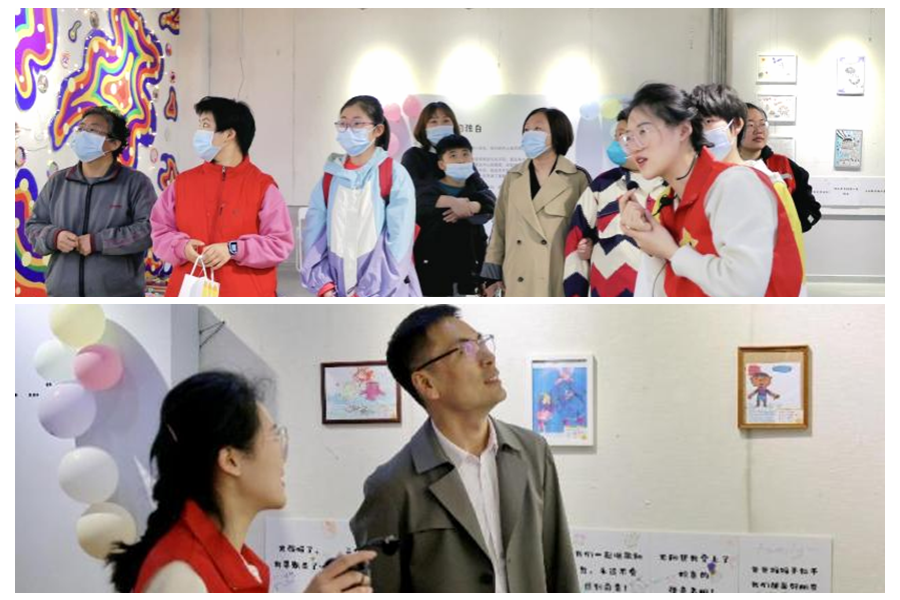 开展当天,我们也邀请了展出作品的小作者、家长和特校老师前来观展。家长们看到自己孩子的画挂到墙上,都惊叹,“哇,宝贝这是你画的”;来参展的小朋友记得我们,还想让哥哥姐姐们给他上课,他们的笑容也更加坚定了团队继续努力的决心。我们看到了自闭症儿童通过艺术疗育得到的成长和进步,这就是“以画疗心”团队存在的意义。
