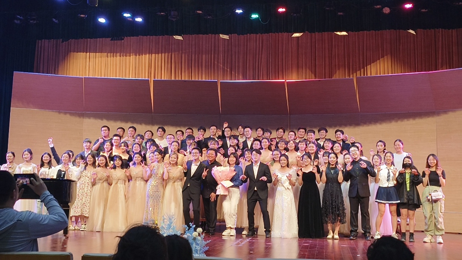最后,孔南老师登台指挥,将全场气氛推到高潮。返场部分,我们带来了团歌《如果明天就是下一生》,诉说对生命的思考,对艺术的热爱;我们演出的《声部介绍歌》上演了合唱团中的“爱恨情仇”,令人忍俊不禁。最后,大家又自发唱起了《难忘今宵》和自编小作品《开心往前飞》,为今晚的演出画上句号。