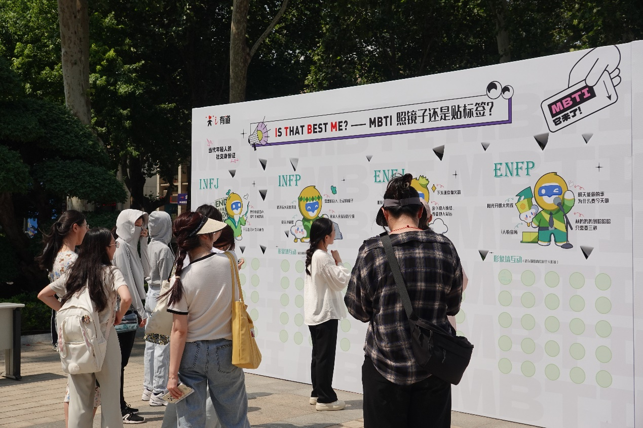 我在活动现场主要负责MBTI趣味科普展区域的引导与介绍。随着越来越多的同学到场,热闹、欢乐、和谐的氛围渐渐充满了整个广场。在服务中途,我偶然把目光投向更宽阔的四周:不同年龄、不同性格、不同外表、独一无二的每个人,都在自由开放地探索着自我,又在探索中与他人、与世界紧密连结,像一片繁茂的森林,枝枝相覆盖,叶叶相交通。我们带着对自我的懵懂与疑问踏入旅程,一路思考,一路交流,心灵的流动包裹着人群畅通流动,途径游戏互动区、兴趣探索区、生涯规划区和身心融合区,来到和入口同一坐标的出口处,已是云散月明。