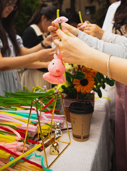 寻美识美,我来到“美心”的站点。阳光和煦、微风轻拂、绿荫婆娑、入目如画,已然心旷神怡、美润心田。扭扭棒制成的百合、雏菊、向日葵、郁金香围簇在花篮中,毛茸茸、胖乎乎,让人叹服心灵手巧。上手也并不复杂,花瓣、花梗、花蕊的颜色都随心选择,哪怕是一朵开在粉色花梗上的、有着蓝色花蕊的绿色花朵,也是可爱动人的。在美的追寻中,我看到了温柔、宽和的包容性与积极磅礴的爱人的能量。