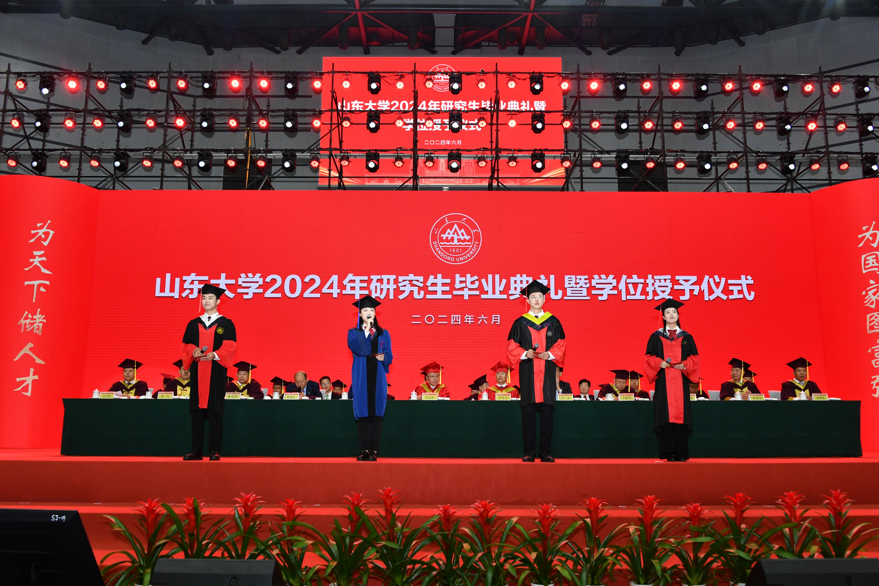 将时间的齿轮拨回到三年前,我曾想象过自己身着蓝袍,在山东大学研究生毕业典礼上默默感受这份毕业的欣喜。在三年后的今天,经过报名选拔,我有幸成为毕业生代表之一,与来自基础医学院的博士毕业生左富文学长、土建与水利学院博士毕业生刘本超学长以及数学学院博士毕业生李梦真学姐一同站在主席台上发言。