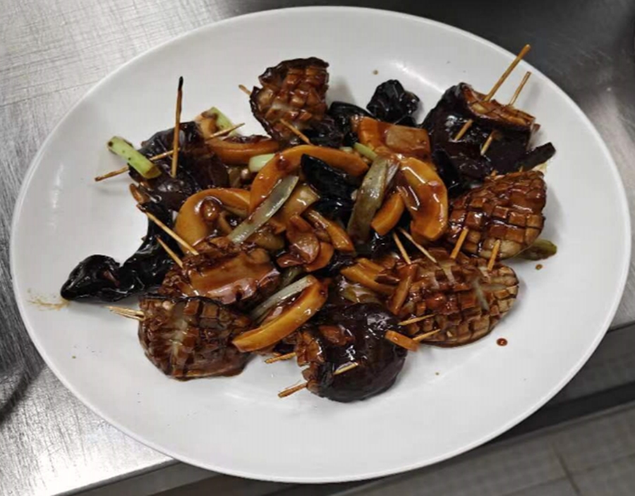 第二天,进入辅食制作学习。我们学习了三种经典鲁菜:孔府樱桃肉、爆炒素腰花和奶汤蒲菜。如果说第一天我们还能手忙脚乱地制作主食,那么今天的三道宴会菜就是“无从下手”:樱桃肉的两次炸制、素腰花的刀工要求、“奶汤”的炒面与熬制,以及调汁、勾芡、控制油温……甚至是刷锅都让我们自顾不暇。忙到最后,我们累得简直都站不起来了。但是亲自品尝到自己掌勺的菜之后,我真真正正地体会到了什么叫“油然而生的骄傲与自豪”。