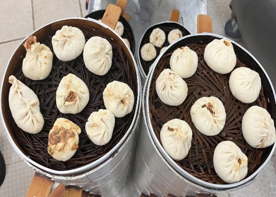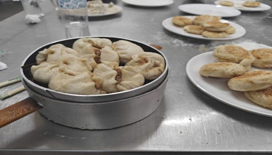 语毕,我们立即开始学习三种主食的制作。我们聆听着食堂资深老师们的教导,从和面开始做起:面粉、酵母和水经过一点一点揉搓、搅拌,逐渐变成了“面光、手光、盆光”的“三光”面团,接下来就是分剂子、擀皮、包馅……转眼间,包子屉上出现了大小形状不一的包子和饺子,甚至还有“笑口常开”“老鼠趴地”等“限定款”包子。除了上来给我们“重重一击”的包子以外,芝麻饼和饺子完成还得比较顺利。就这样,我们完成了三种主食的制作。