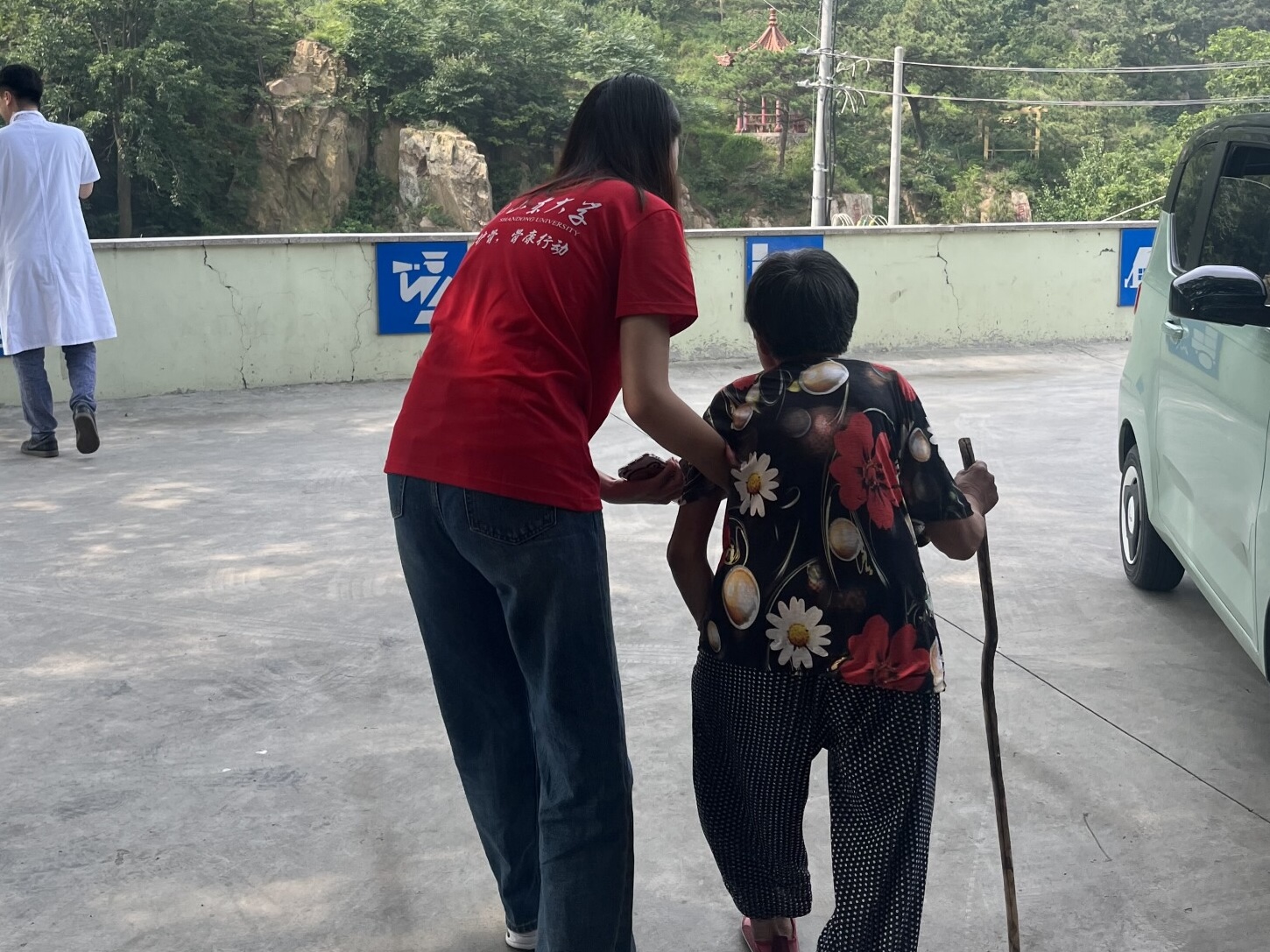从海边山下到山腰梯田,经历一个多小时的车程,我们终于到达北宅卫生院。我引导的第一位老人便是一位重度骨病患者。年轻时她有一米七的身高,而现在不到一米五,只能借用木头长棍艰难前行。经过骨密度筛查后,因为实在担心奶奶的身体,我便主动送奶奶回家。一路上,我弯着身搀扶着奶奶,听着奶奶用朴实的青岛话叫我“小嫚儿”,诉说着她的骨病。我的内心感到十分心疼。回到社区卫生中心,乡医对我们说,还有一些需要筛查帮助的百姓在家来不了。骨松义诊已经持续多年,乡亲们十分信任团队的口碑,很多家里有卧病在床老人的乡亲们纷纷表示想让我们到家里看看,于是,我跟随李春林师兄及齐鲁医院的医生入户二十余家乡亲,为老人义诊。在我搀扶回家的那位老奶奶家里,她给我们展示平时吃的药品,说需要吃这两种强效止痛药才能勉强维持生活。我内心不由地感慨,如果奶奶早期接受及时的干预和治疗,她不至于造成现在的困境,而这,更加坚定了我“健康中国,吾辈定将学之践之”的信念。