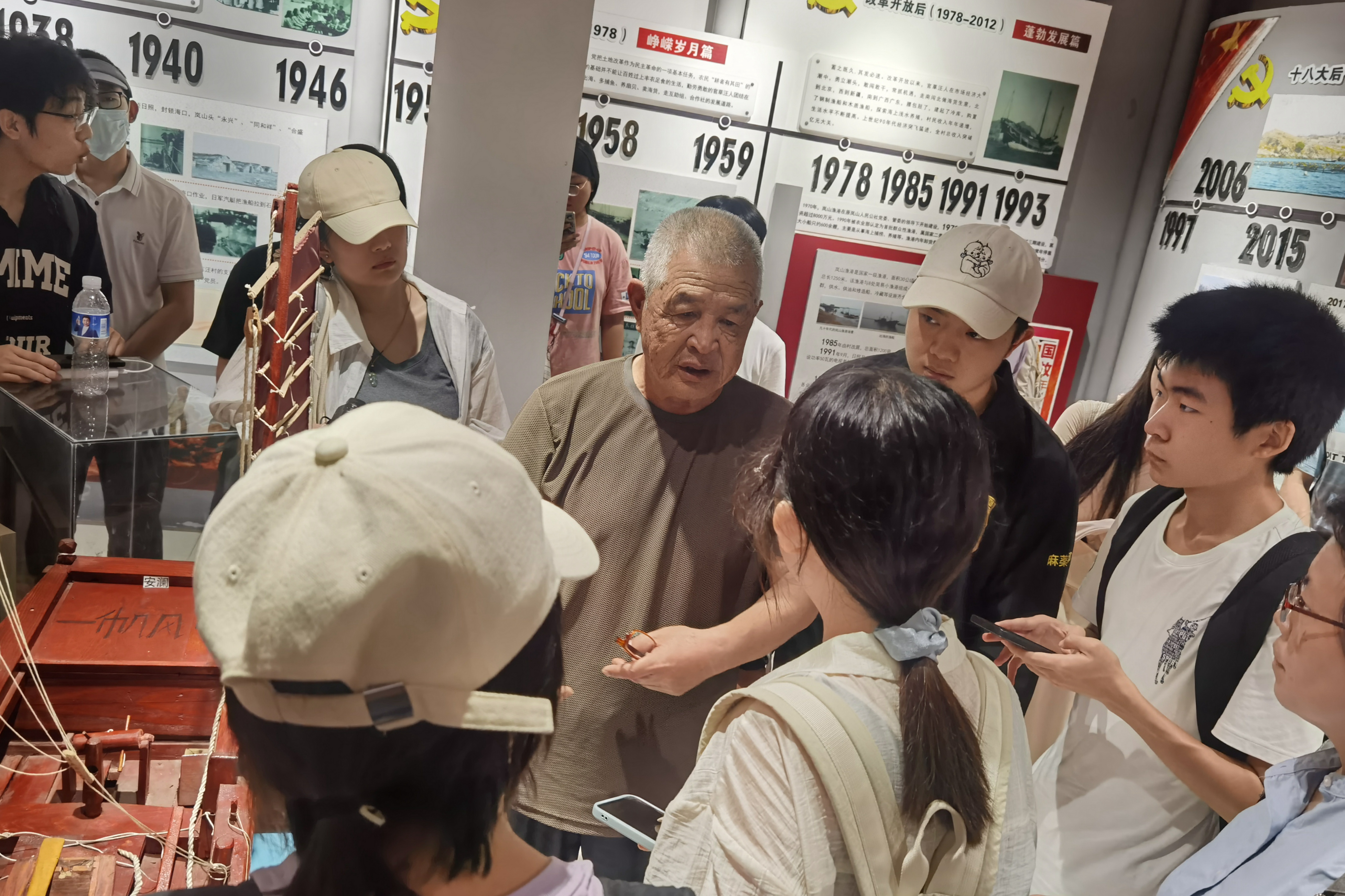 在调查渔业词汇的工作中,我们按照分组分类开展,各有专攻。有的小组负责渔民的文化习俗,有的小组负责海产品,而我们组聚焦于渔船及其部件、渔具的方言表达。我们组前往官草汪“渔村记忆”村史馆,听当地老一辈渔民介绍渔船。同组的学姐和学长都认真地记录,并询问船上的各种部件、各种渔具在当地方言中的表达方法,反复确认其读音与字形。在渔港,我们登上渔船,踩在甲板上,亲自去感受渔船、感受岚山的渔业气息。临近中午,我们参观了日照绿茶的发源地——原安东卫北门外村,了解制茶工艺,体验日照茶文化。下午,我们前往当地的农贸市场调查海产品的相关词汇,听当地人怎么称呼各种海产品。当天晚上,我们在会议室进行小组内讨论,整理出我们调查到的渔业方言。调查最后一天,我们来到了最后一站——磴山,走过茂密的竹林、越过溪流、穿过寺观,沿着蜿蜒的登山路向上行,最终在山间一隅,见到了清代名士许瀚于同济年间留下的诗碑。碑上刻着明代杨继盛所作的诗句:“羡君堪作王家瑞,愧我徒为食禄臣。不是未酬忧国恨,愿披蓑笠结东邻。”