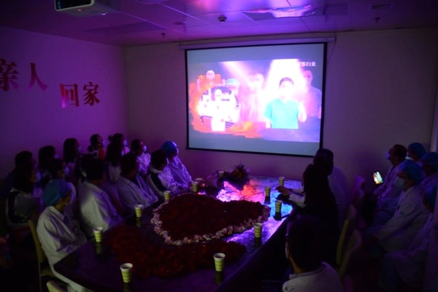 昨日,齐鲁医院心外科重症监护室全体医护人员一起欢迎抗击新冠肺炎勇士们回家。心外科重症监护全体兄弟姐妹们编排了手指舞《听我说谢谢你》,以一次次深深的鞠躬,一段段“听我说谢谢你”,向奋斗在抗疫一线的同事们致敬。