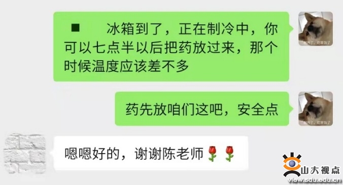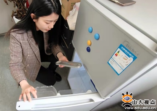“看,这台冰箱,就是我们学生需要的。”封闭管理的第二天,一位学生焦急地来到我办公室,“老师,我储存药品的专用小冰箱坏了,怎么办?我的药需要2-8度冷藏,否则药就失效了。”这位同学的病情是我早就知道的,安抚好学生情绪后,我第一时间上报了院领导,并跑去协调宿管中心、校园超市以及学生食堂能够实现冷藏的设备。党委保卫部副部长董太华与山大资本运营有限公司董事王帅在接到电话求助后,立即调度校园超市的食品冰箱,清空后在保障供电安全的前提下,供该学生储存药品。同时,学院迅速行动采购了一台冰箱供同学们后续使用。“十分感谢学校老师们的帮助,在这样的特殊时期解决了我的燃眉之急,在外院学习生活特别安心”,这位学生一直在跟我道谢。这几天,分发防疫物资、给崴脚的学生送电动车去做核酸、帮助同学们传递校外必需物资……一件件暖心的小事,组成了学院老师们的抗疫生活。对于同学们来说可能是值得感动的,但是对于辅导员老师们来说,将关心关爱学生落实到解决实际问题中去,这就是日常。