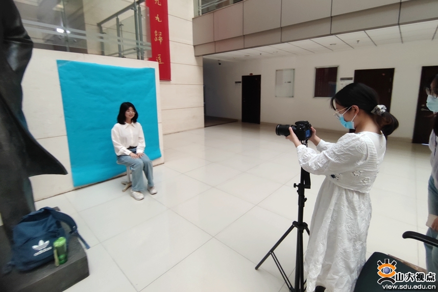 周六上午,老师带着我们去知新楼数学学院大厅“踩点儿”、布置现场,我们扛着相机、三脚架、灯光等设备,在选好的光线比较充足的墙上贴好蓝色和红色的背景布,在数学学院辅导员老师和志愿者的帮助下布置好拍摄场地。天公作美,知新楼八楼的自然光非常适合拍摄,对相机进行了设置调整和试拍之后,下午,我们的拍摄正式开始。