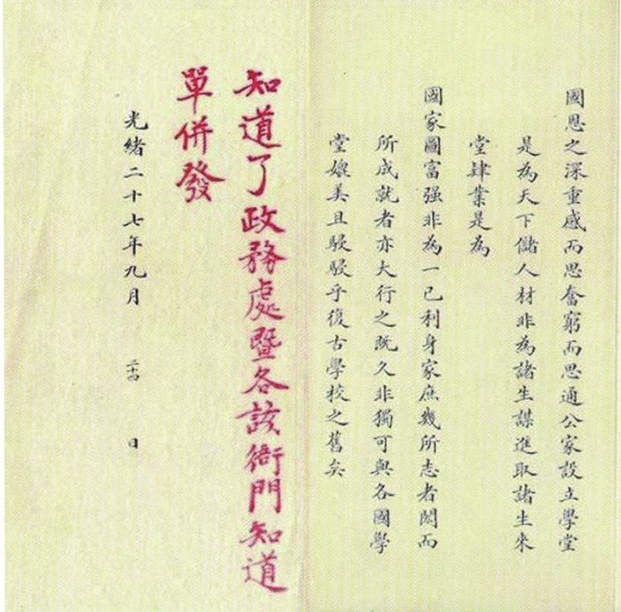 八月二日(9月14日),光绪颁谕“着各省将所有书院,于省城均改设大学堂”。从后来各省巡抚上奏给朝廷的奏折上看,当时各省都在因资金、校舍,特别是西式课程师资缺乏、教材缺乏、仪器设备缺乏以及对新式学校教育模式不明,犹豫观望,行动迟缓。而当时正在河南休假的袁世凯,在看到朝廷谕令的那一刻,如何接续当年春季的筹划,遵照谕令兴办好新式大学堂的盘算在一瞬间胸有成竹。他即刻启程赶回山东,迅速行动,“通饬各属一律举办”,在一个多月时间内“筹资择地,先于省城改设大学堂,以为之倡”。