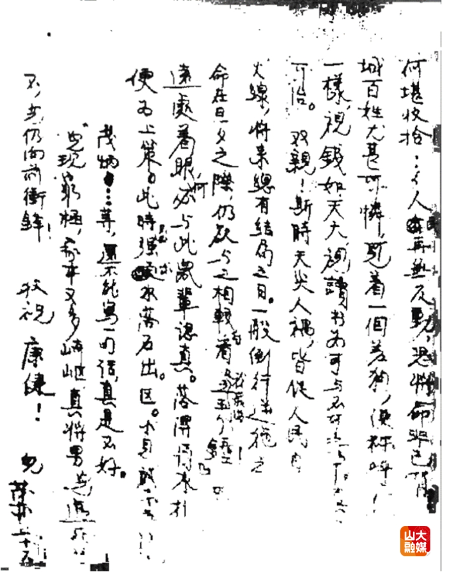 1932年12月,已被判处死刑的祖茂林在济南监狱写下一封家书:“干革命就会有牺牲,望双亲千万千万看得开些。家是我所恋的,弟妹是我所爱的,但是破碎的祖国更是我所怀念热爱的。虽然在干革命救国的大事业中,我的力量简直够不上沧海一粟,可是集天下之水滴而汇成大洋。我希望我能在救亡的汪洋中,竭我一滴之微力。”